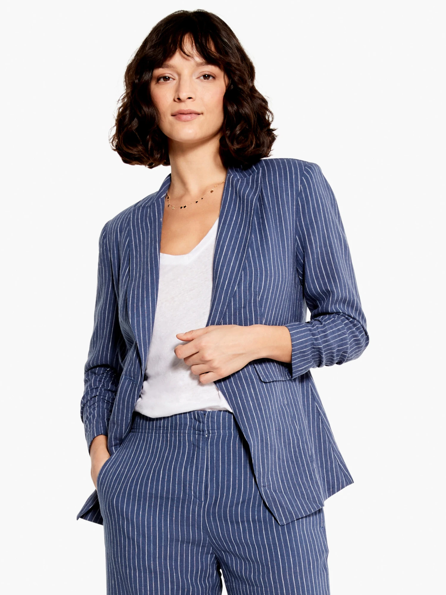 Shake up your next light outer layer with a completely unique, yet distinctly classic jacket, all thanks to its namesake scrunch sleeve detail.Pair it with the matching wide-leg angle pant to make a suit, or create your own look. The 3/4 sleeve length makes for a fun interplay between inner and outer layers at the sleeves. We made it lightweight with a traditional notch collar, single button front, and functional pockets.