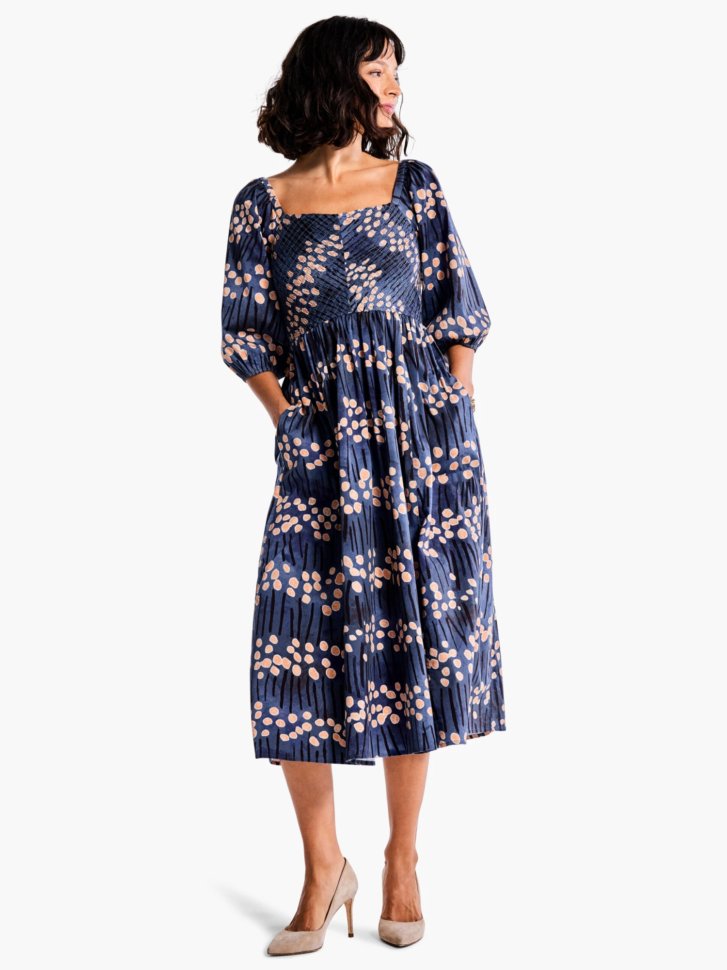 Inspired by the transition between summer and fall and day and night, the Firefly Glow Dress is set for anywhere and anytime thanks to its complementary colors and timeless, very fun shape. Designed for a fitted top half before flaring into a spin-ready bottom. We love the flounce elbow sleeves, side seams, and the elastic on the back. Falls below the knee.