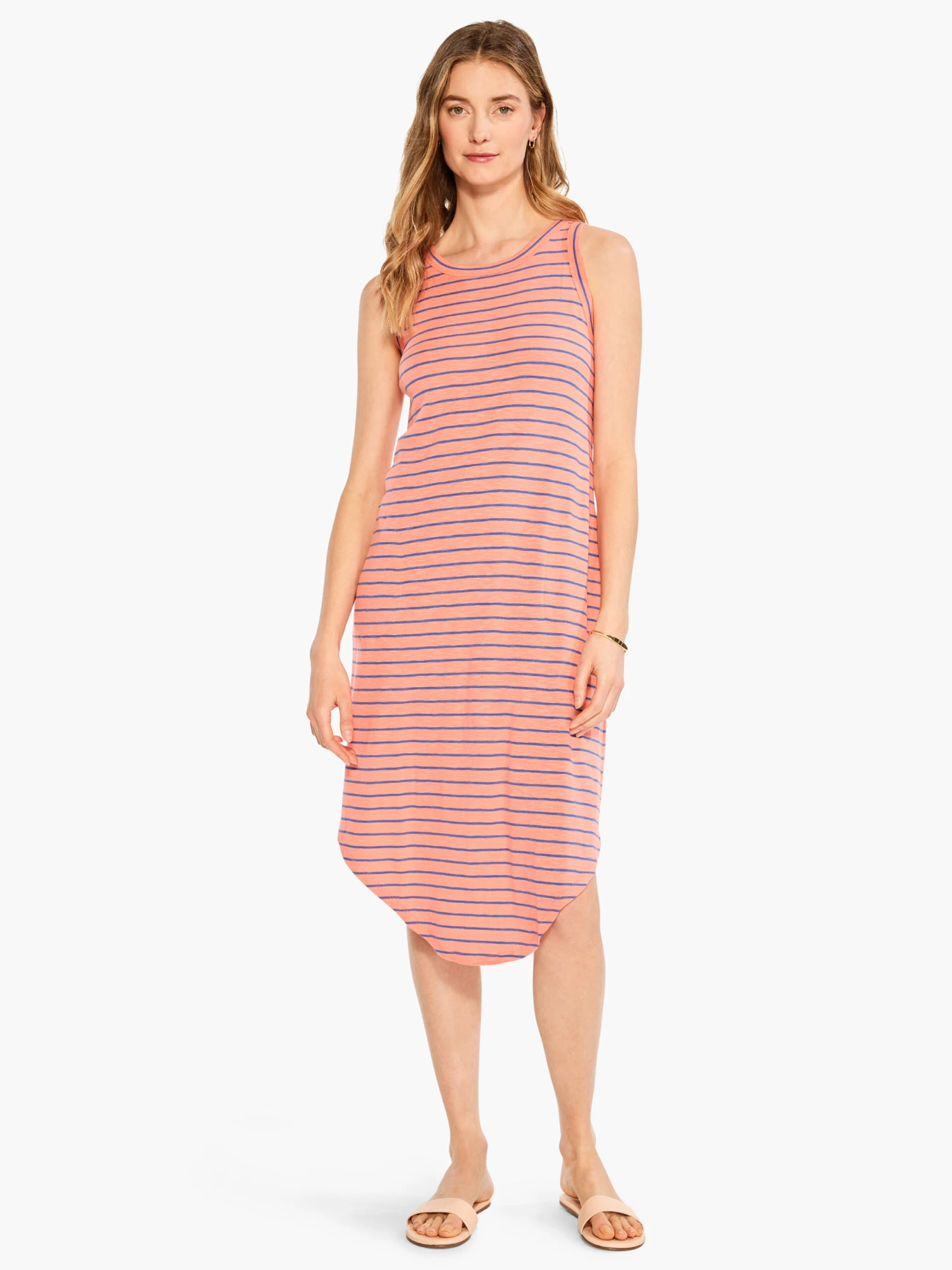 A classic striped T-shirt dress that’s perfect for days spent by the water, or at least cultivating beach vibes. Made from a cotton modal blend that’s breezy and super drapey, we included pockets at the side and placed stripe detailing at the collar and arm openings. Sleeveless with a hem that’s slightly shorter at the sides for more shape. Full length and designed to fall below the knee.
